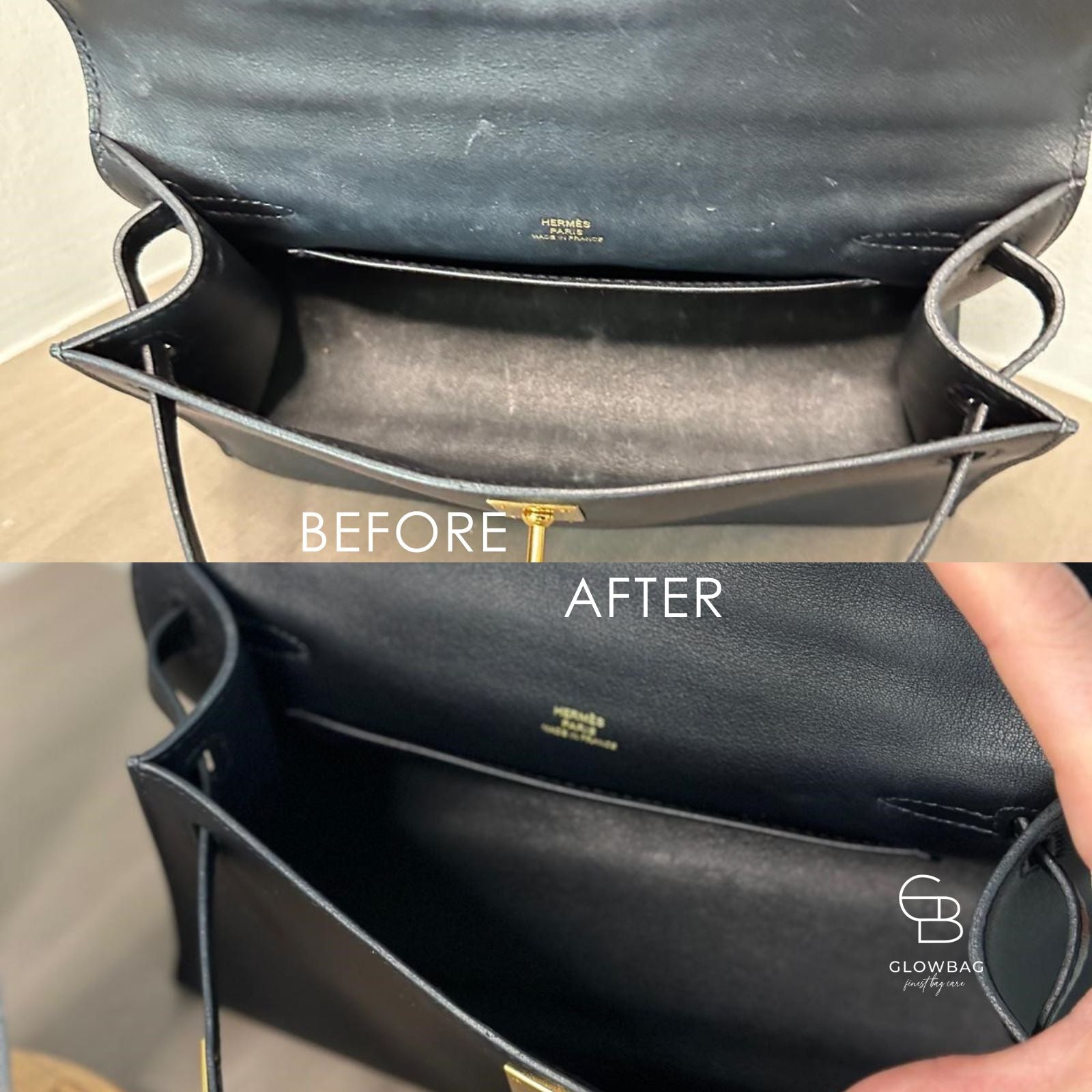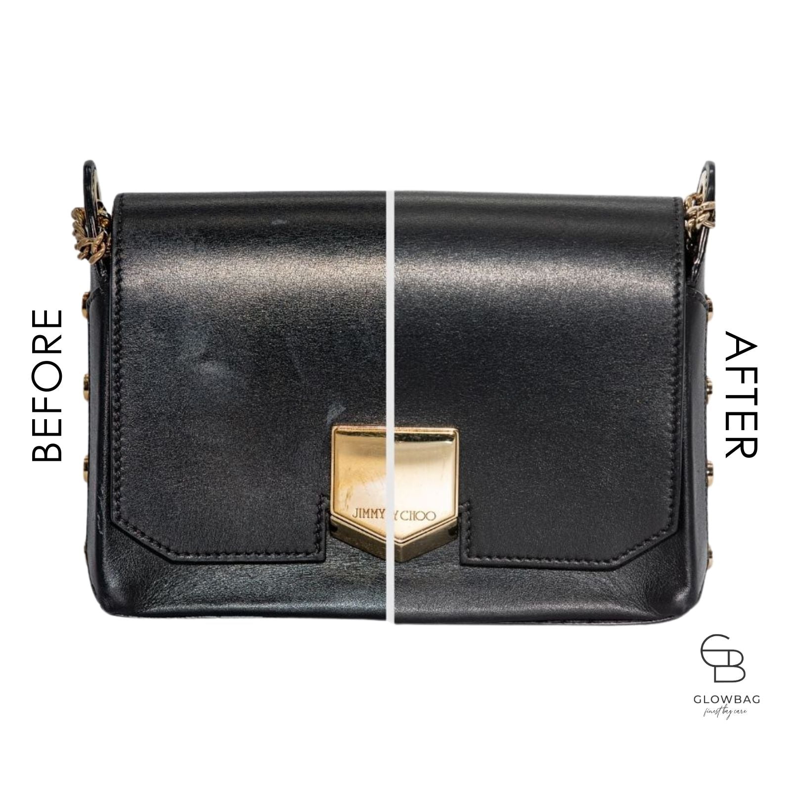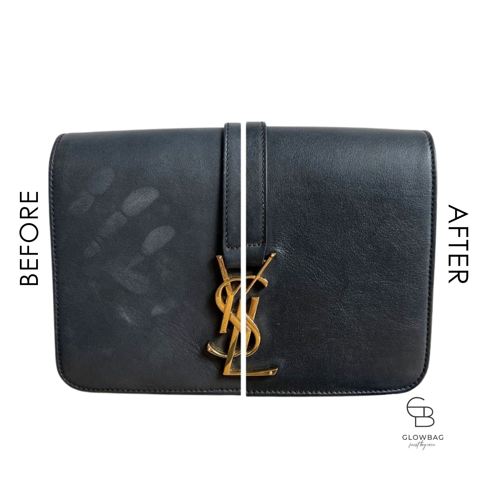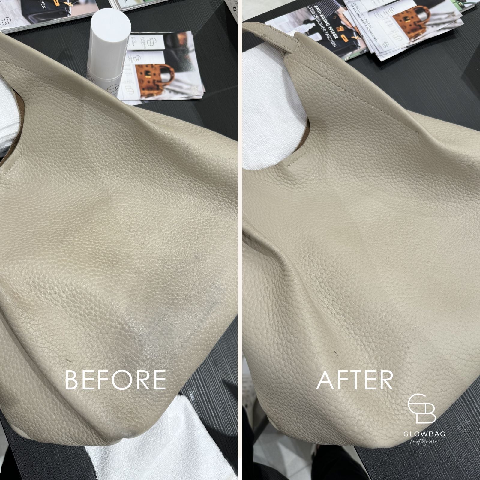 Wachsbasierte Lederpflegeprodukte hingegen versiegeln Verschmutzungen, statt sie zu entfernen. Obendrein hinterlassen sie helle Rückstände. Dies wiederum beeinträchtigt das ursprüngliche Erscheinungsbild und macht das Leder fester. Die Farbe wirkt blasser und matter. Oft zieht dann die klebrigen Rückstände Staub und Schmutz an. Im Gegensatz dazu ermöglicht die wasserbasierte GLOWBAG Formel eine echte Reinigung ohne Rückstände. Das Leder kann atmen und die nachfolgende Pflege besser aufnehmen. Die Farbe wirkt aufgefrischt und das Leder der Handtasche bleibt geschmeidig und natürlich.